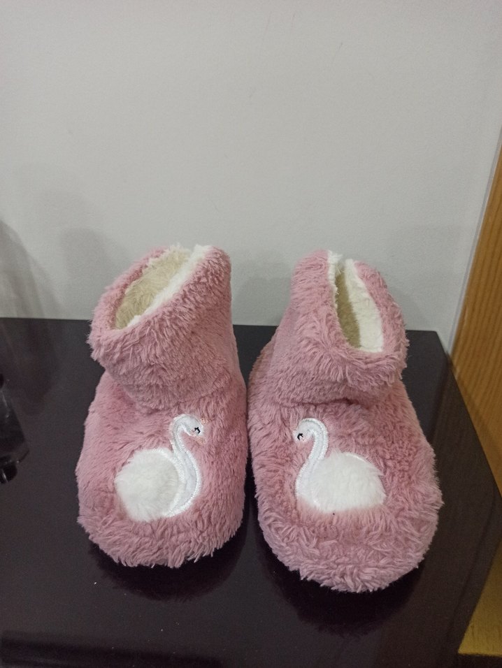Kızlar için pembe, yumuşak ve tüylü kumaştan, kuğu nakışlı sıcak ev terliği. hasarsız, sıcak tutan bir panduftur