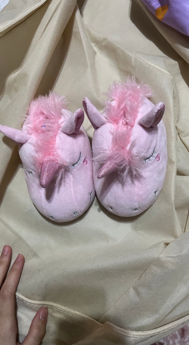 Kızlar için pembe, unicorn figürlü işleme ve tüylü detaylara sahip yumuşak terlikler.