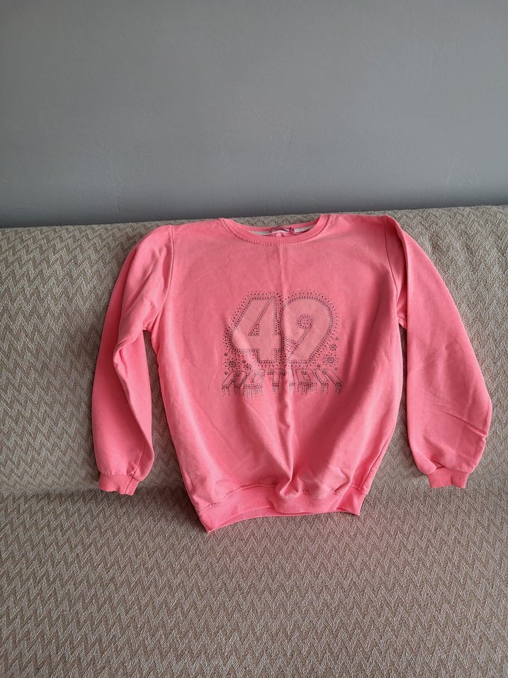 Pembe renkli, uzun kollu, yuvarlak yakalı ve bol kesim kız sweatshirtü. Yumuşak ve sıcak kumaş üzerine örme baskılı desene sahiptir.