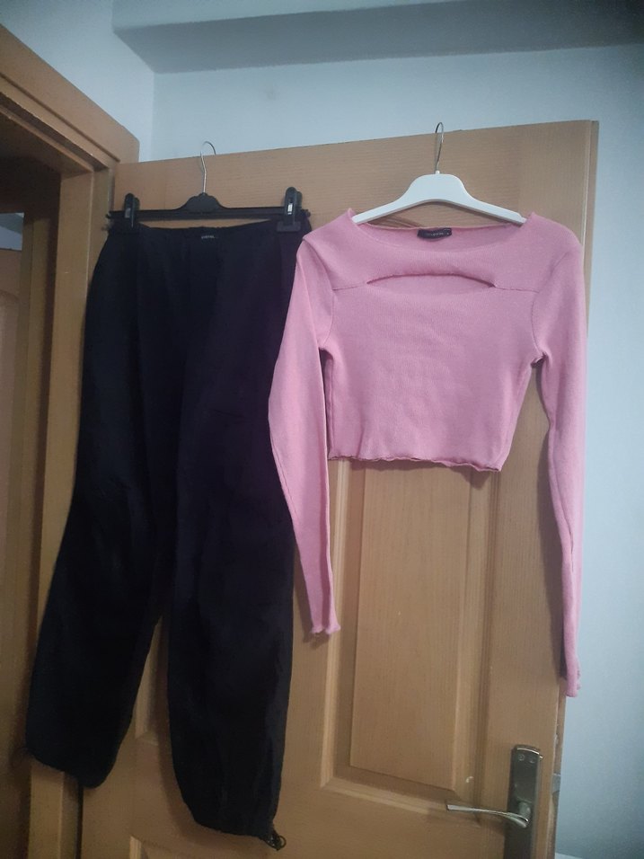 Kızlar için pembe, uzun kollu, bisiklet yaka sweatshirt ve siyah eşofman. Rahat ve şık sokak stili kombinidir.