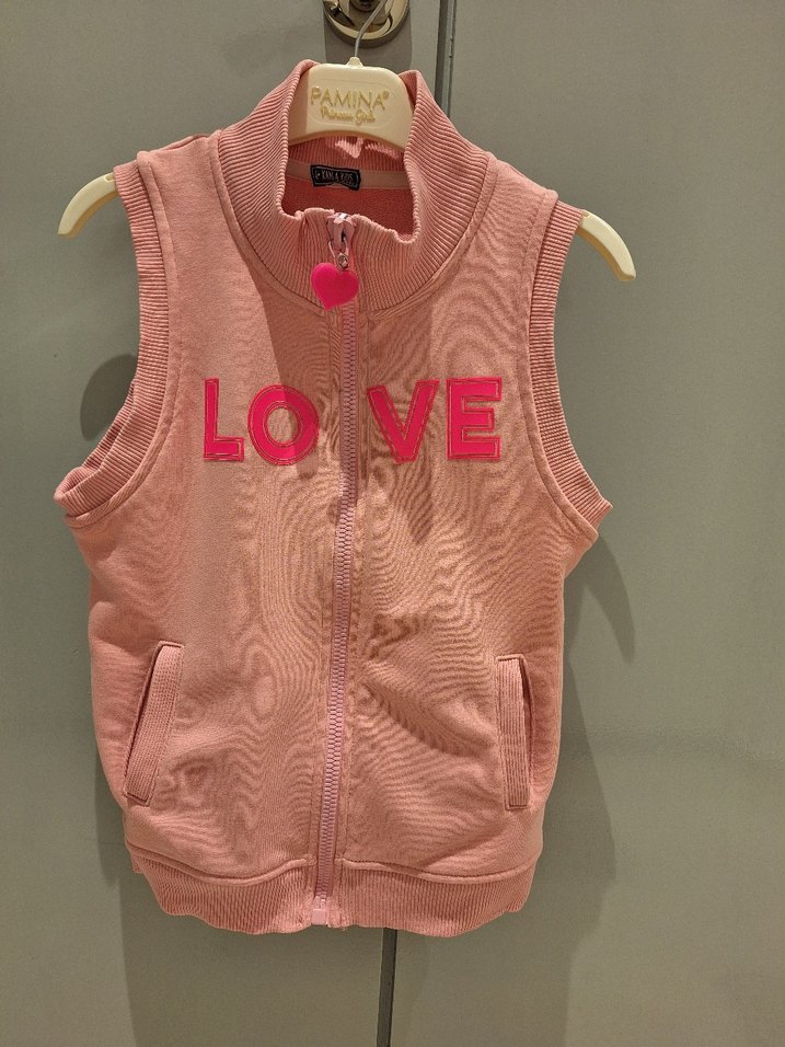 Yumuşak ve sıcak kumaştan yapılmış, yüksek yakalı ve fitted kesim pembe kolsuz yelek. Önünde fermuar ve 'LOVE' yazısı bulunur. Hiçbir yerinde yırtık sökük lekesi kesinlikle yoktur