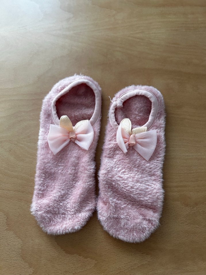 Kızlar için pastel pembe renkte, yumuşak ve sıcak tutan tüylü kumaştan yapılmış ev terliği. Üzerinde şık bir fiyonk detayı bulunur. Yıkandı ama giyilmedi