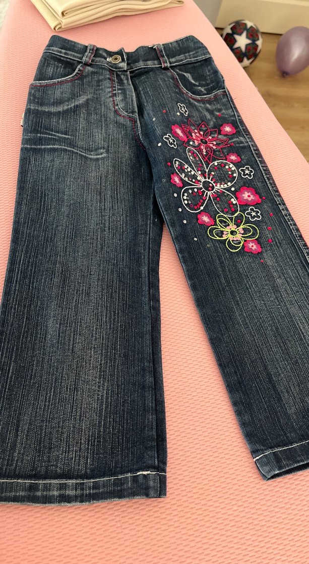 Koyu denim kumaştan, pul işlemeli çiçek desenli, bohem tarzda kızlar için dar kesim pantolon.