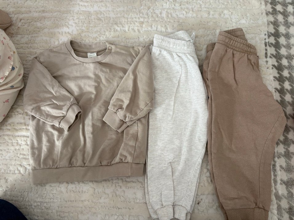Kızlar için rahat kesim, bej ve gri tonlarda, yumuşak keten kumaştan uzun kollu ve yuvarlak yakalı sade eşofman takımı.
