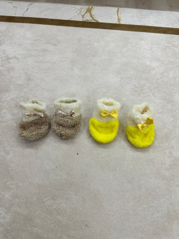 Kızlar için yumuşak kürk görünümlü örgü, renkli bağcıklı ve bağcık detaylı sıcak ev terlikleri. (2.ç) #bebek #giyim #zıbın #elbise