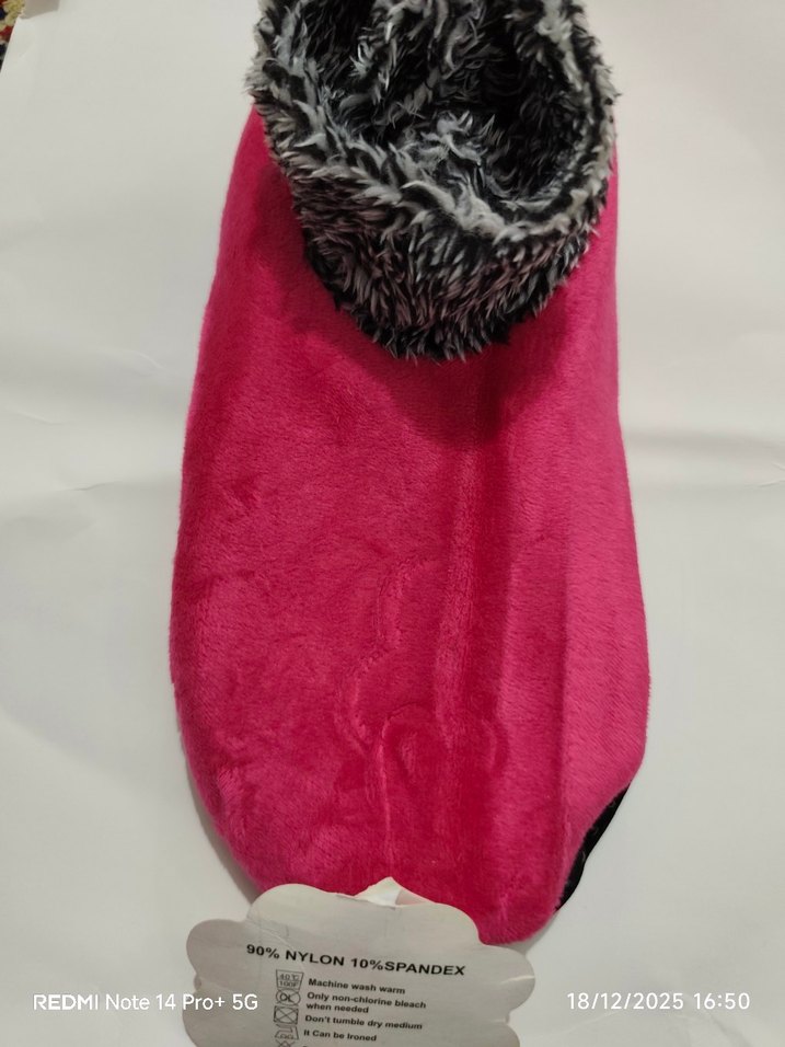 Kızlar için renkli bağlamalı desenli, yumuşak pembe kumaş ve kürklü detaylı sıcak terlik. Trend sokak stili için uygundur.