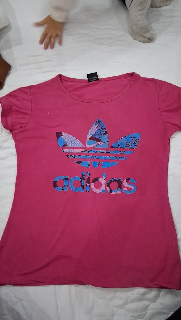 Pembe renkli, dar kesim, kısa kollu ve yuvarlak yakalı kız tişörtü. Üzerinde renkli baskılı adidas logosu bulunur. Yumuşak sentetik kumaştan üretilmiştir.