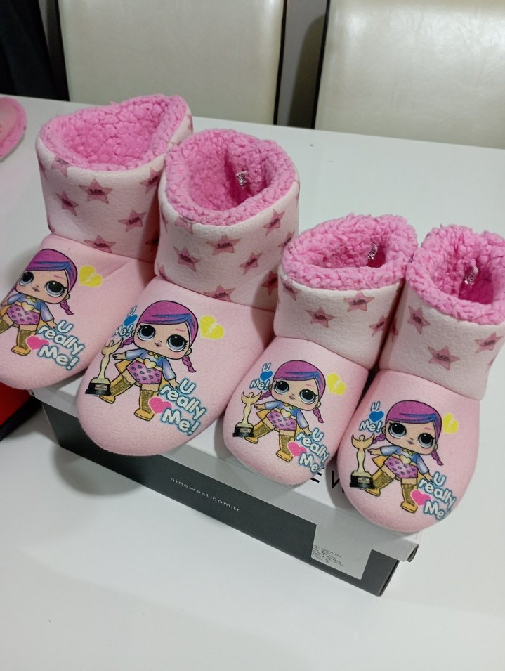 Kızlar için renkli baskılı ve cırt cırtlı pembe sıcak terlikler. Yumuşak ve sıcak kumaş iç astar rahatlık sağlar.