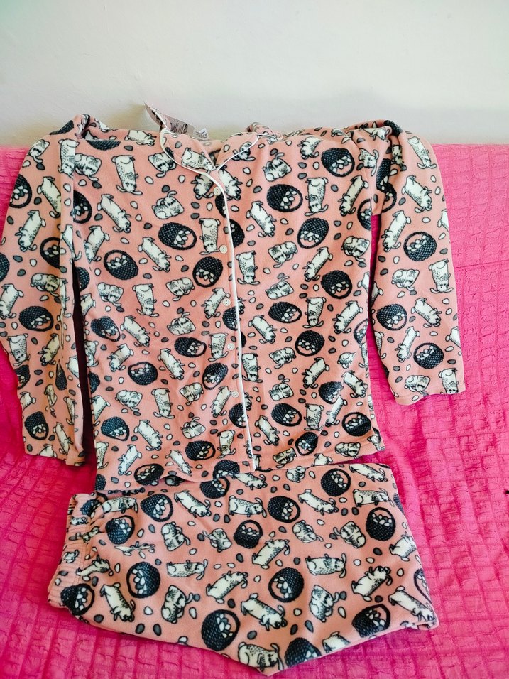 Kızlar için uzun kollu, yuvarlak yakalı ve düğmeli, yumuşak polar kumaştan renkli baskılı pijama takımı.