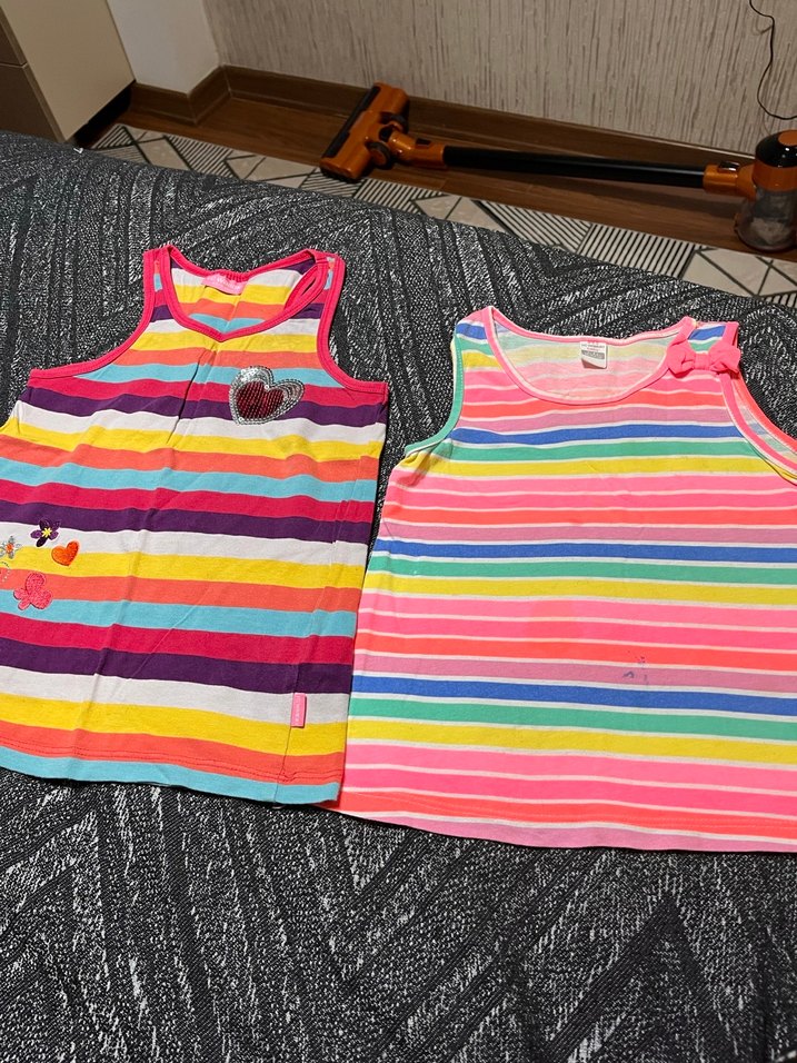 Renkli çizgili, askısız kız tişörtleri, bol kesim. Birinde düğme detayı ve kalp patch var, bohem tarz için uygun.