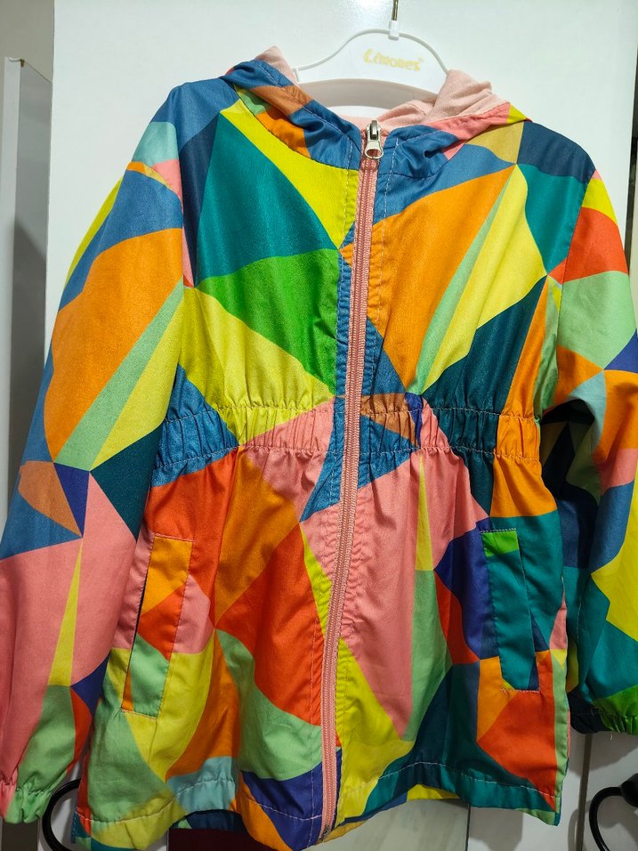 Renkli ve gevşek kesimli kız yağmurluğu, fermuarlı ön ve yakalı tasarıma sahiptir. Sentetik kumaştan yapılmış, canlı batik desenlidir.