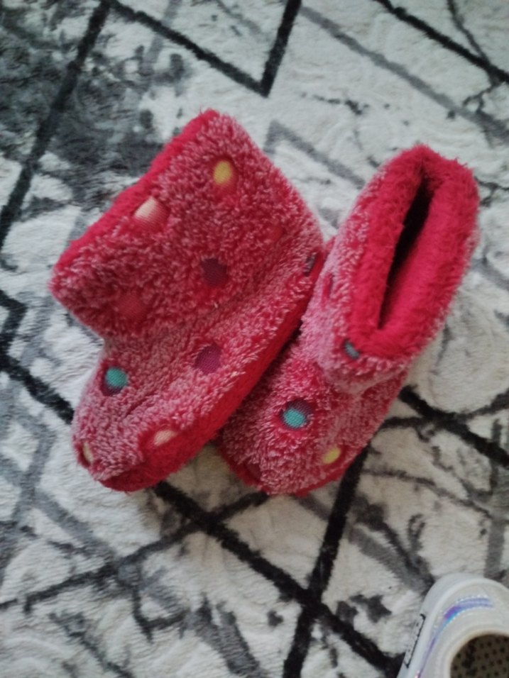 Yumuşak ve sıcak kumaştan, renkli nakışlı puanlı, örme pembe terlikler. Bohem ve retro tarzını yansıtır. Evde rahat kullanım için uygundur.