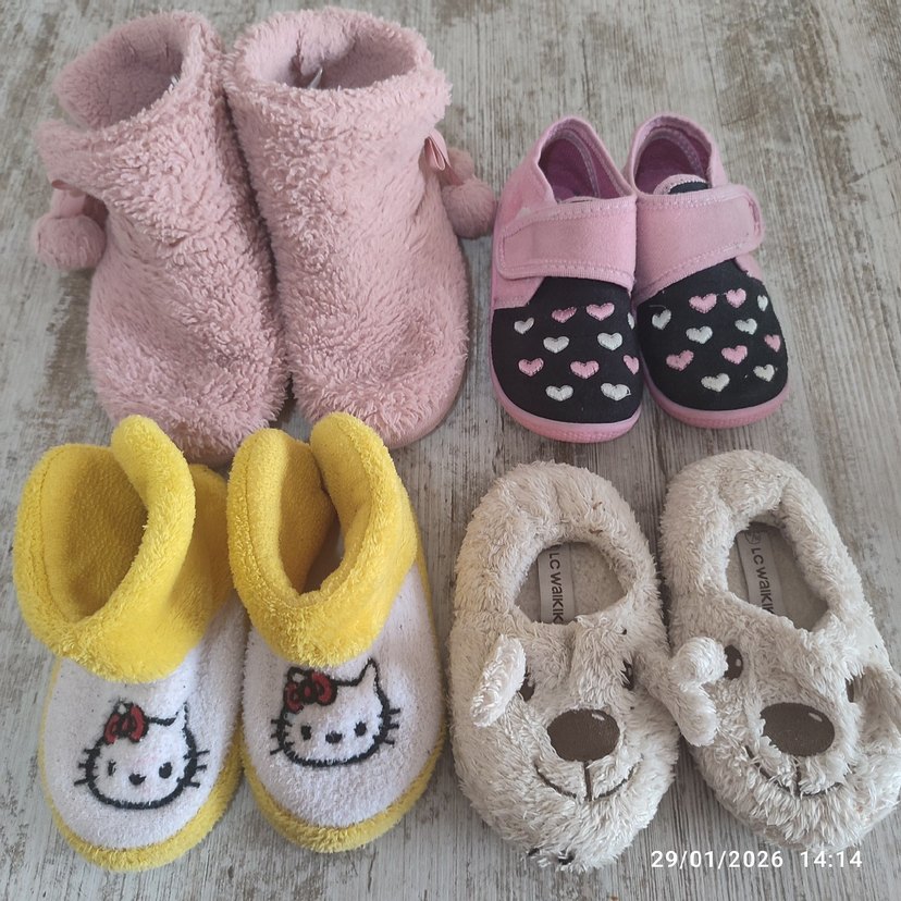 24-27 numara arası Kullanılmış kullanılabilir durumda 4adet ev ayakkabısı,panduf.ufak tefek kusurları ve lekelenmeler mevcut fotoğraflarda belirtmeye çalıştım ama giyime engel değil.sıfır gibi beklenti de olunmazsa sevinirim. sıkıntılardan dolayı fiyatı uygun tutucam iade kabul etmiyorum