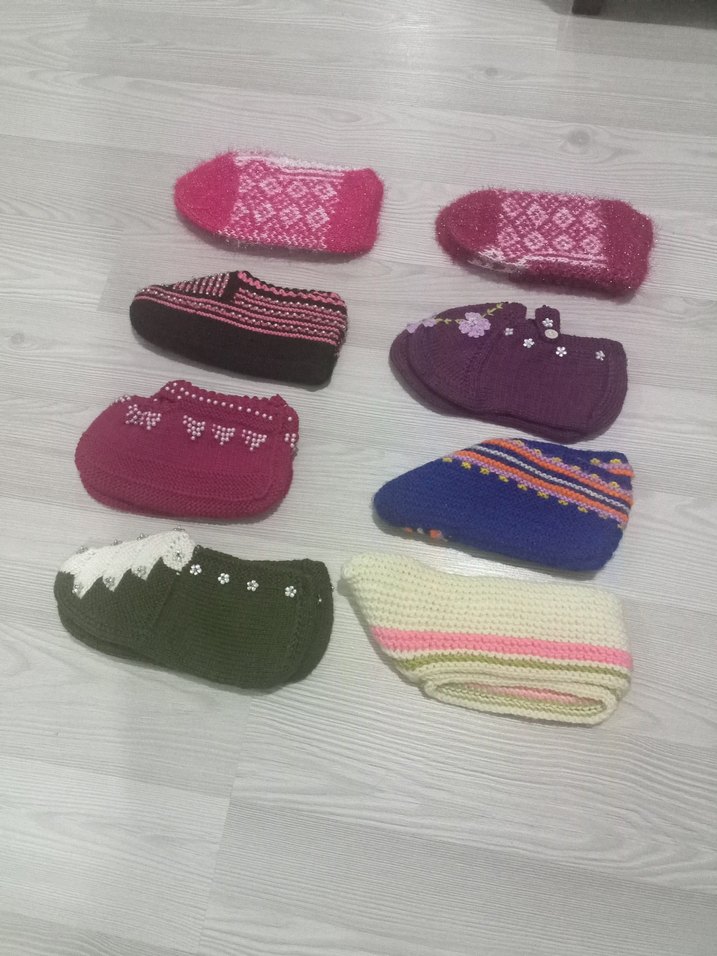 Kızlar için renkli işlemeli ve örme kumaştan yapılmış sıcak ev terlikleri. Konvansiyonel tarzda, rahat kullanım sağlar. Çeyizlik patik hiç kullanılmadı adet fiyatıdır