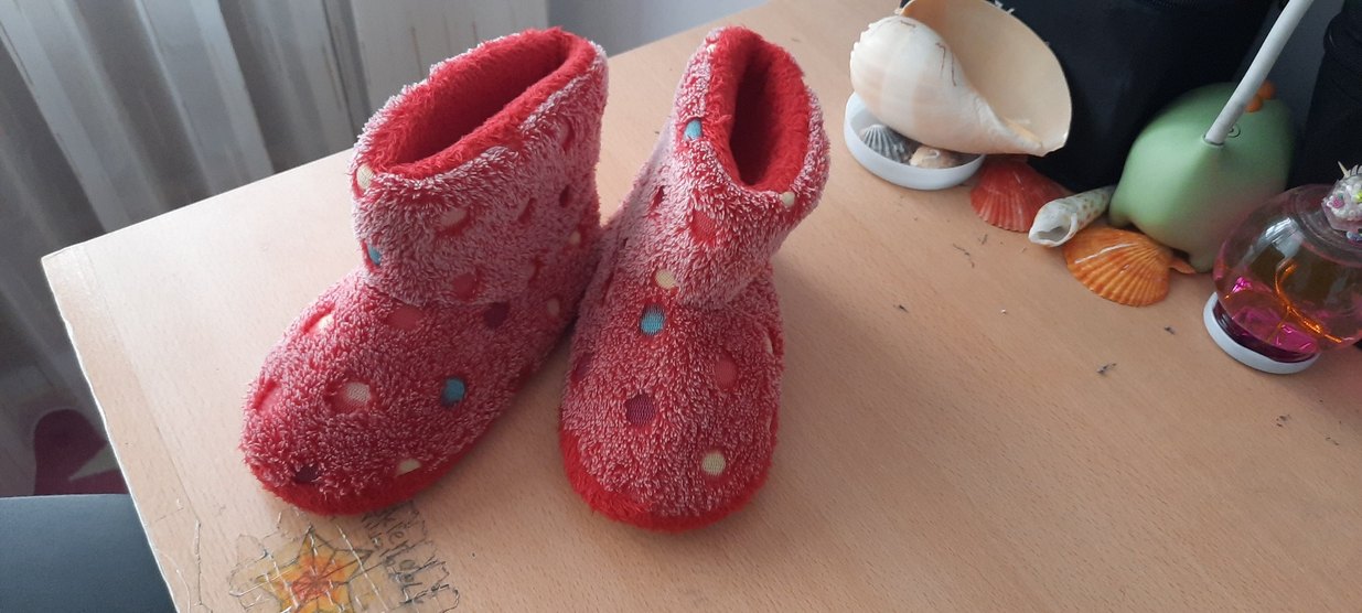 Kızlar için renkli örgü sıcak terlikler, yumuşak ve sıcak kumaştan, kırmızı ve çok renkli noktalarla rahatlık sağlar. peluş panduf 29 -30 numarası bir sorunu yok sayılı giyildi