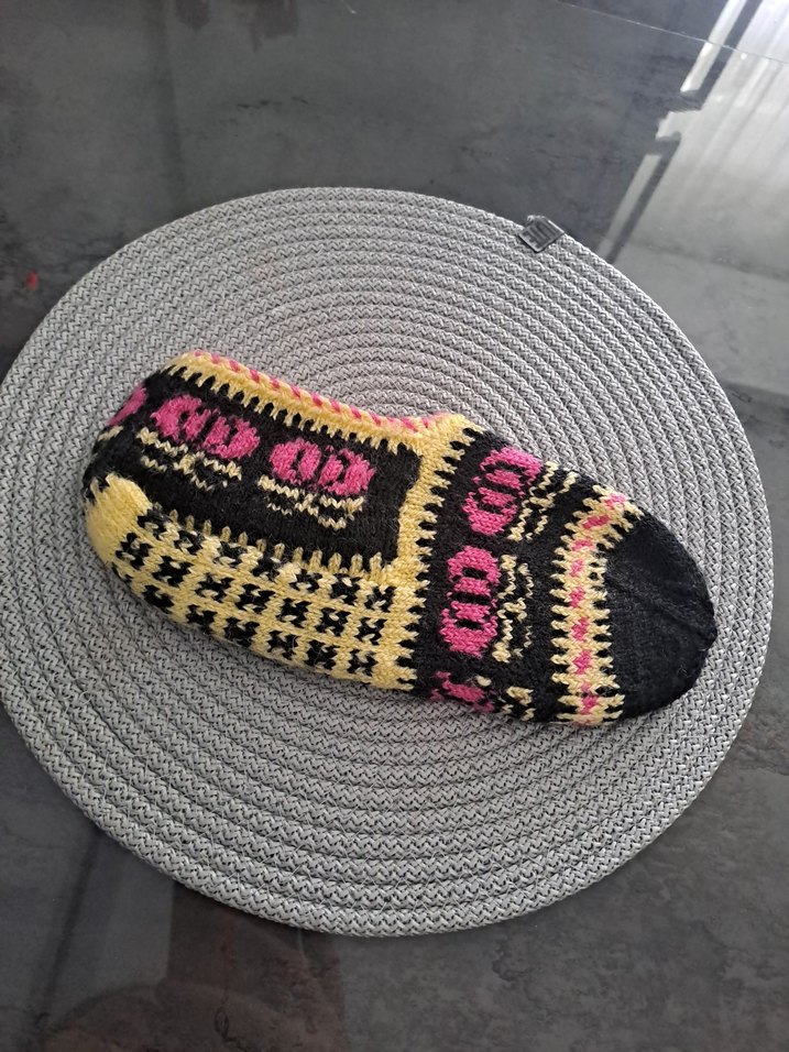 Kızlar için renkli, desenli örgü ev terliği. Bohem, hippie ve retro tarzlara uygun, sıcak tutar.