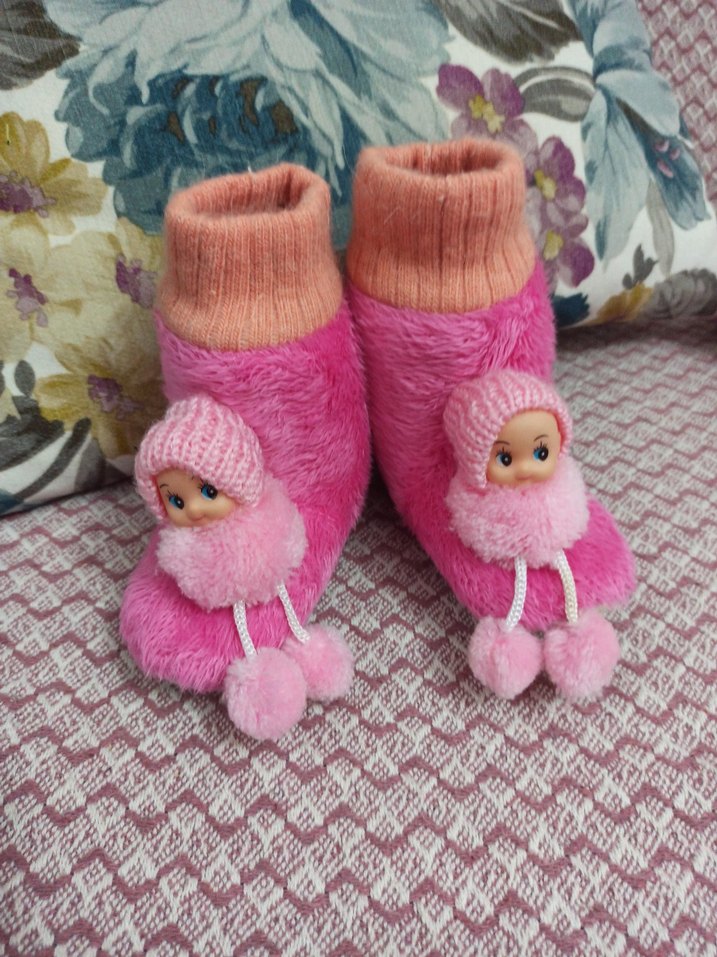Kızlar için renkli, yumuşak ve sıcak kumaştan pembe ev terliği. Örgü manşetli ve nakışlı bebek süslemeli, rahat kullanım sağlar. arkasında defo var dikilmesi gerekiyor Marka temsilidir
