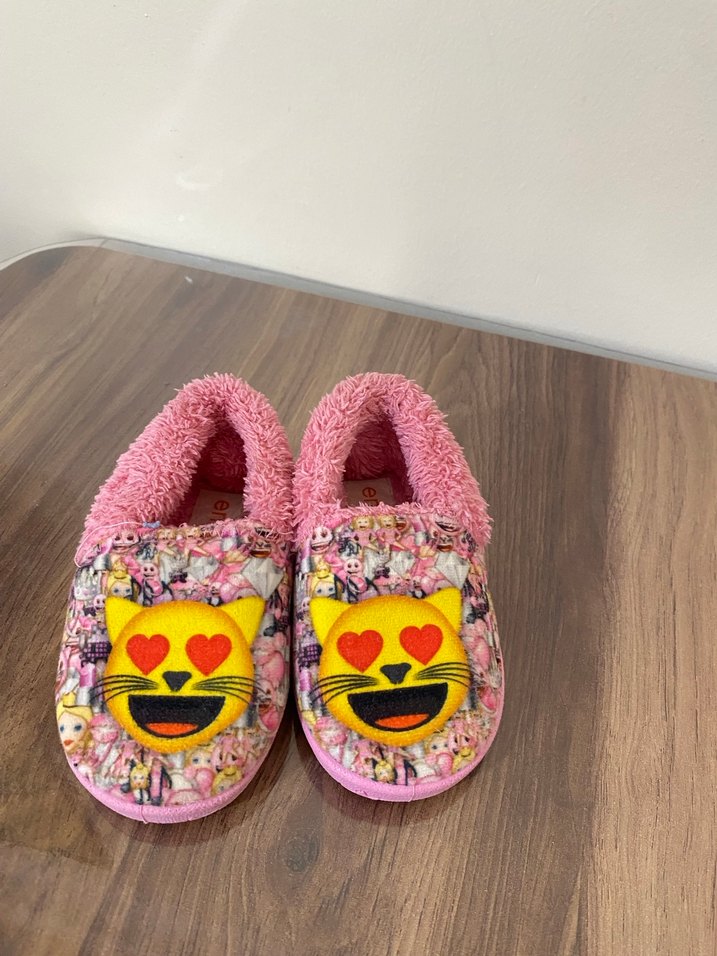 Kızlar için yumuşak peluş astarlı, renkli batik desenli ve önünde pop kültür emojisi bulunan sıcak ev terliği. Rahat ve canlı bohem tarzda.