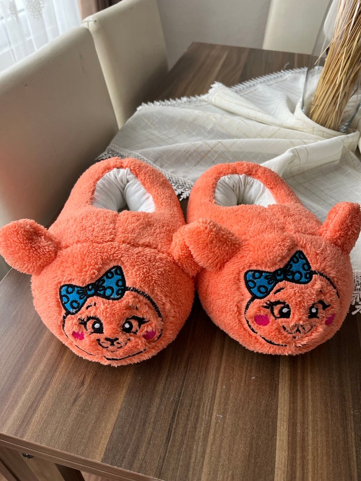 Renkli peluş kumaştan, nakışlı pop kültür yüzleri ve kürk detaylı kız çocukları için sıcak ve eğlenceli terlikler.