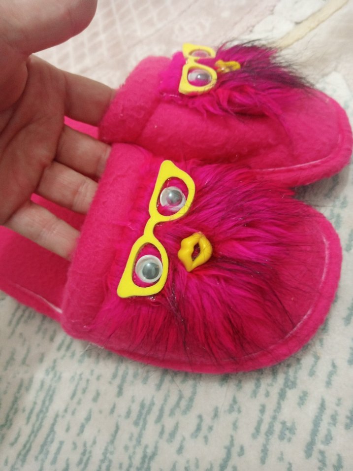 Kızlar için yumuşak polar kumaştan yapılmış, renkli pembe ve kürklü detaylı ev terliği. Nakış desenleri ve pop kültür tarzıyla dikkat çeker.