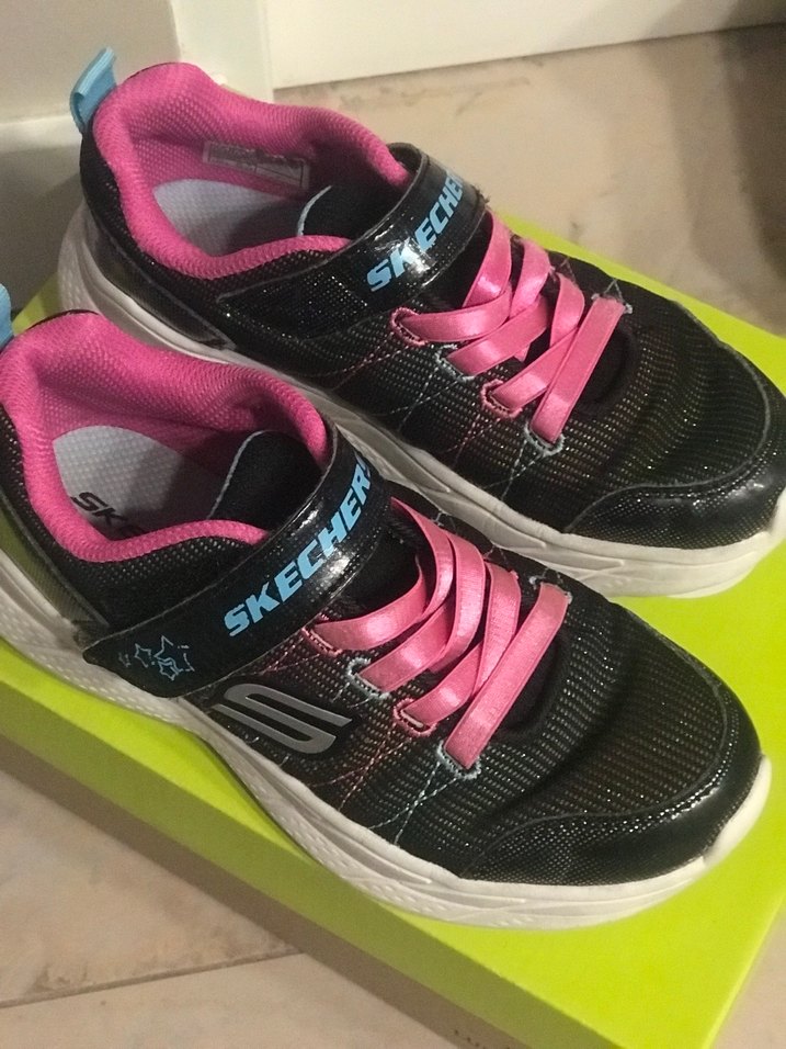 Renkli desenli ve pembe detaylı Skechers kız spor ayakkabısı, kolay giyilen cırt cırtlı ve kauçuk tabanlıdır.