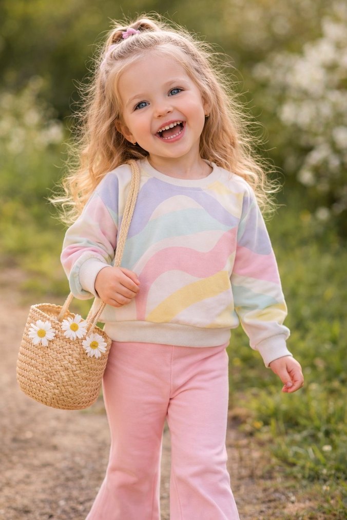 Kızlar için bol kesim, pastel renklerde tie-dye desenli, kabarık uzun kollu sweatshirt. Yumuşak ve sıcak kumaştan, kapüşonlu yakaya sahip. Takımm