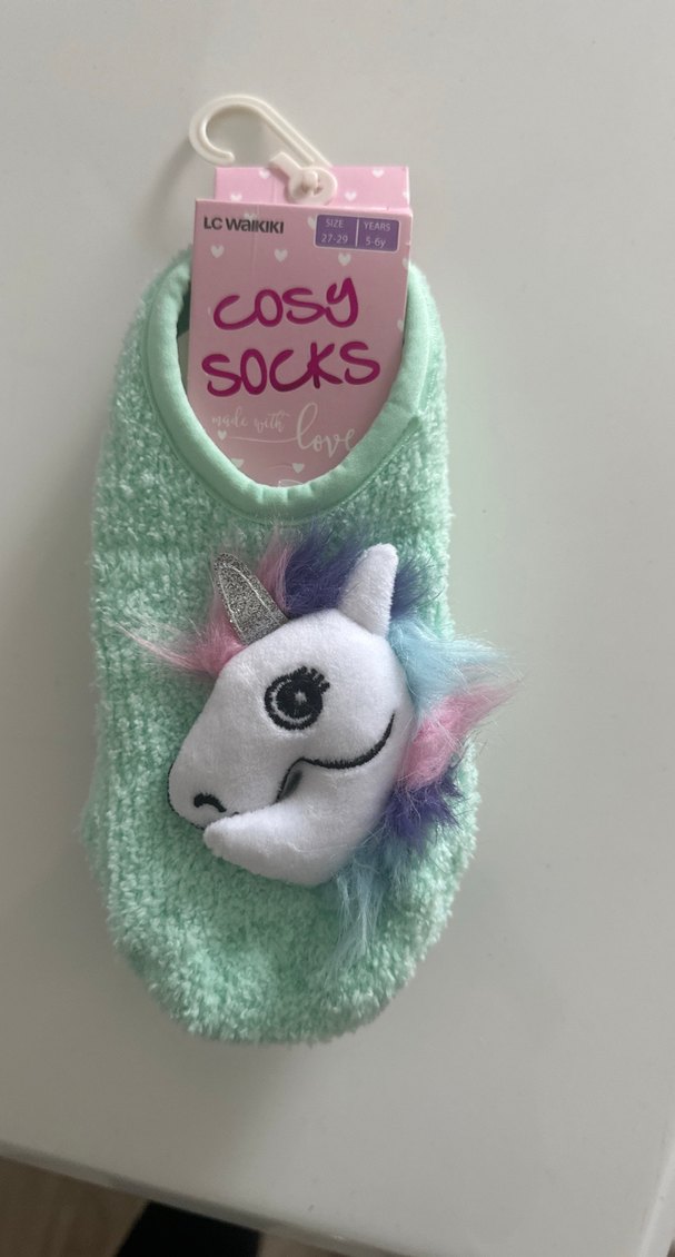 Renkli örgü yapıda, yumuşak unicorn figürlü, sıcak tutan pastel renkli kız terliği.