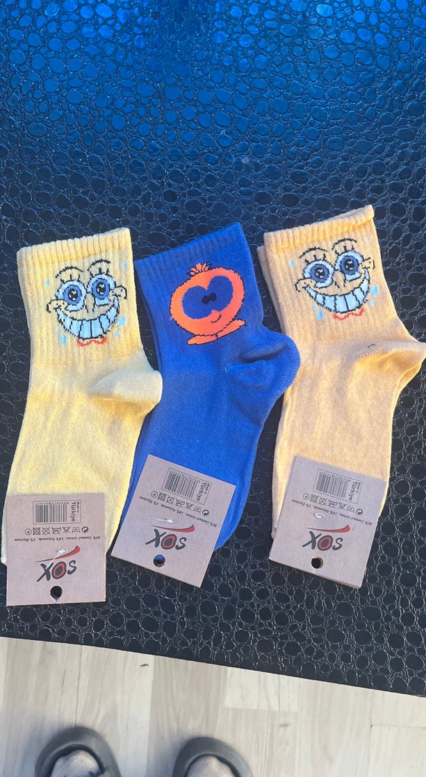 Yumuşak yünden yapılmış, mavi ve sarı tonlarında eğlenceli baskılı renkli kız çocuk çorapları.