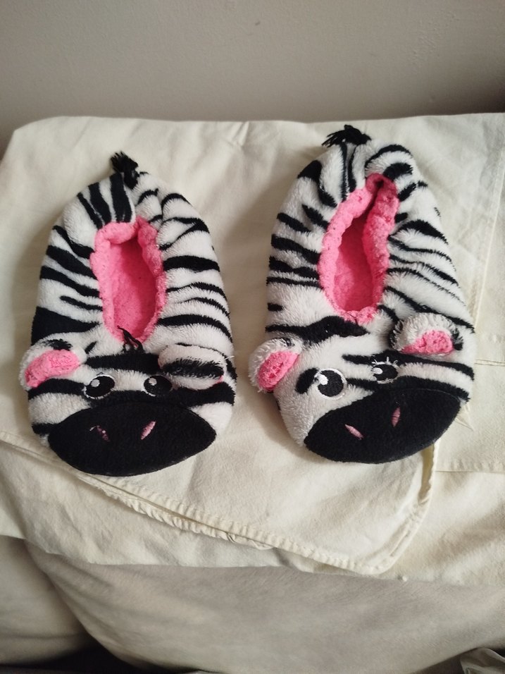 Yumuşak örgü polar kumaştan yapılmış, renkli zebra desenli kız çocukları için sıcak terlikler. İç kısmı pembe ve konforlu. 5/6 yaşa olur