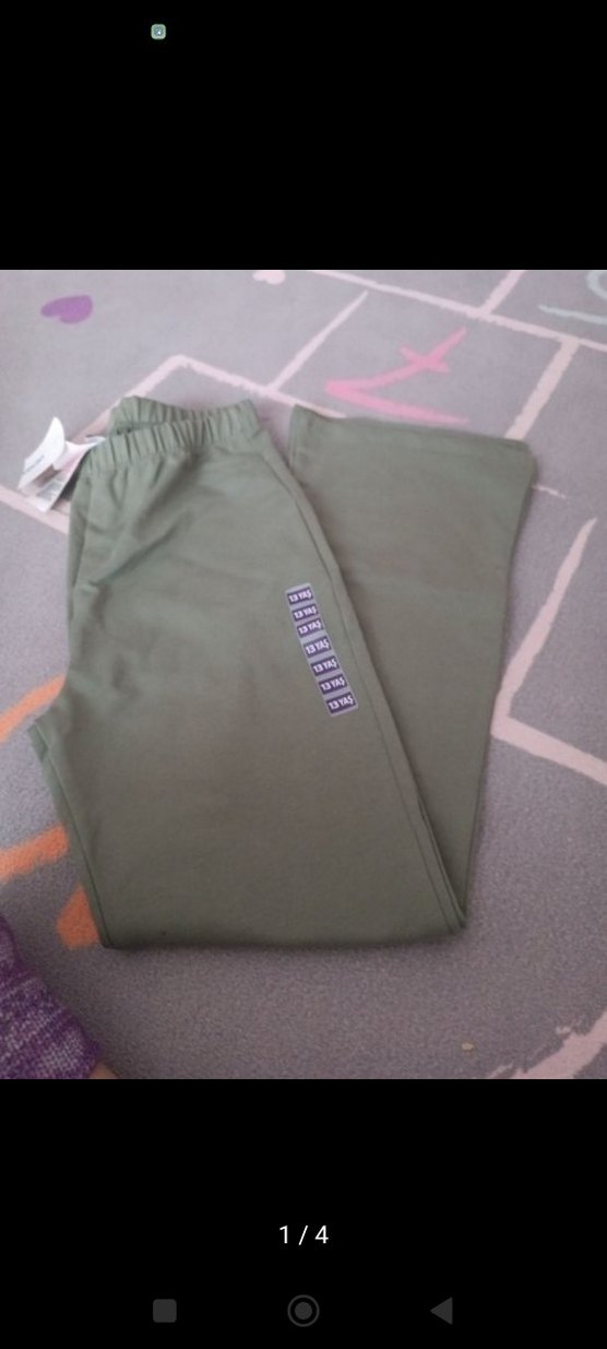 Kızlar için salaş kesim, yeşil renkte, yumuşak ve sıcak kumaştan rahat pantolon. Desensiz, sokak tarzına uygun.