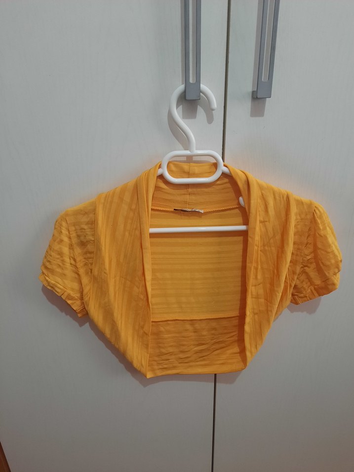 Kızlar için plise detaylı, straplez yaka ve kısa kollu sarı bolero. Esnek kumaştan günlük sokak tarzı için uygun.