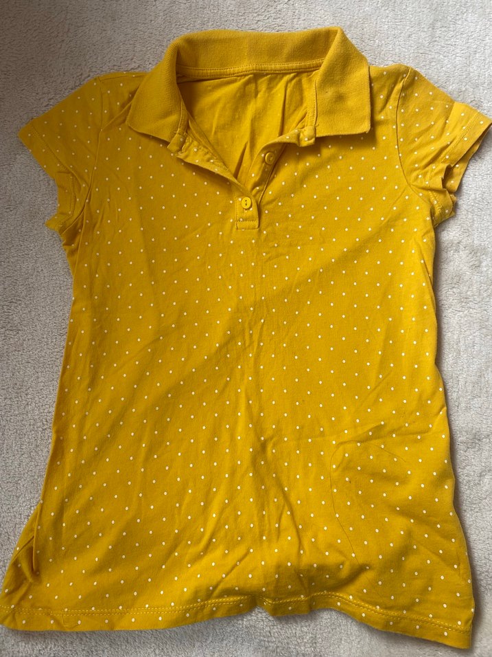 Kısa kollu, düğmeli yakalı kızlar için fitted polo tişört. Parlak sarı renk ve küçük beyaz noktalarla sokak stiline uygun.marka temsilidir