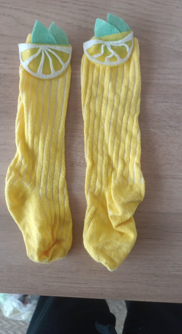 Kızlar için sarı renkli, örgü yapıda, üst kısmında limon dilimi detaylı, düz ve renkli çoraplar.