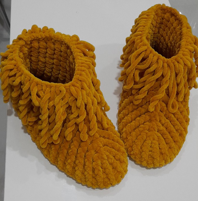 Kızlar için örgü yün malzemeden yapılmış, canlı sarı renkte sıcak ev terliği. Bohem tarzda, dokulu ve desensiz tasarıma sahiptir. el emeği