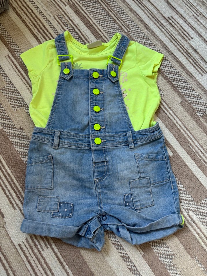 Kızlar için sarı tişörtlü düğmeli kot tulum