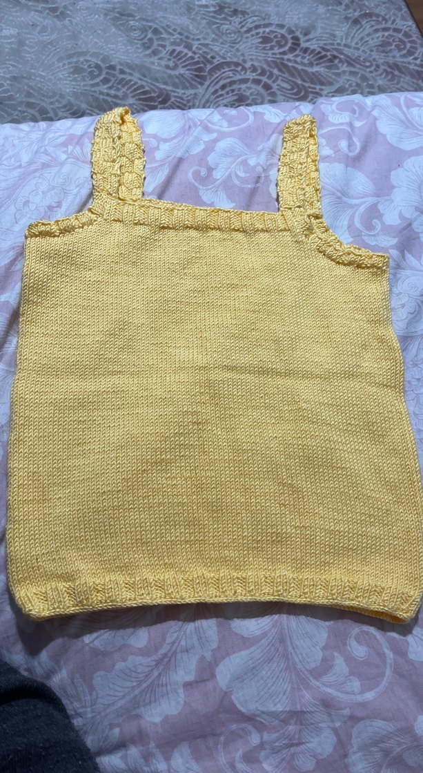 Askılı, straplez yaka, bol kesim, parlak sarı triko kız yeleği. Bohem tarzına uygun, sade dokulu.