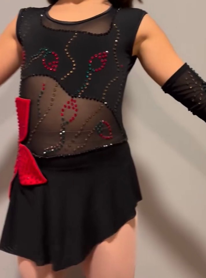 Dar kesim, pul işlemeli ve şeffaf detaylı siyah üst. Kolsuz tasarım, cesur ve gotik tarzda. ✨7-8 yaş gösteri kostümü özel dikim
