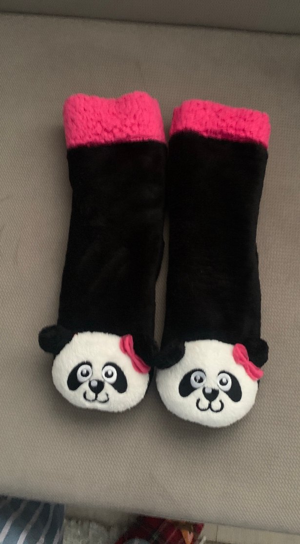 Kızlar için örgü, renkli pembe manşetli ve ayak ucunda panda yüzleri olan sıcak terlikler. Yumuşak kumaş ayakları rahat tutar.