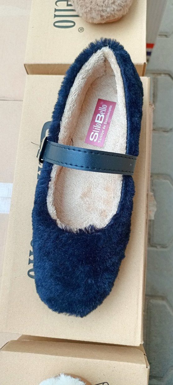 Kızlar için parlak kayışlı ve yumuşak kumaştan yapılmış sıcak terlikler. Desensiz ve rahat bir tasarıma sahiptir.