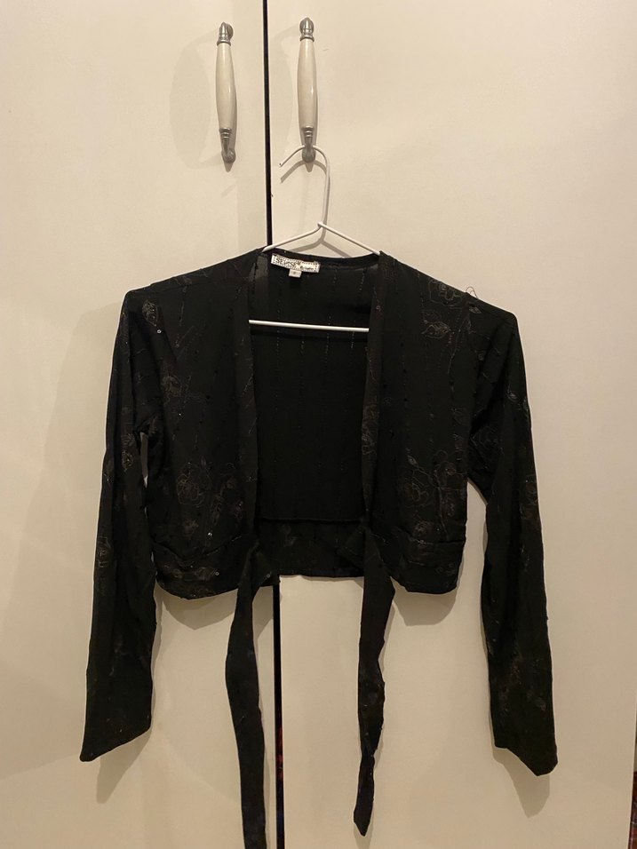 Kızlar için siyah, uzun kollu, halter yaka ve bağlamalı bolero. Keten kumaştan ve batik desenlidir. Hediye geldi hiç giymedim dar geliyor bana kilo aldığım için