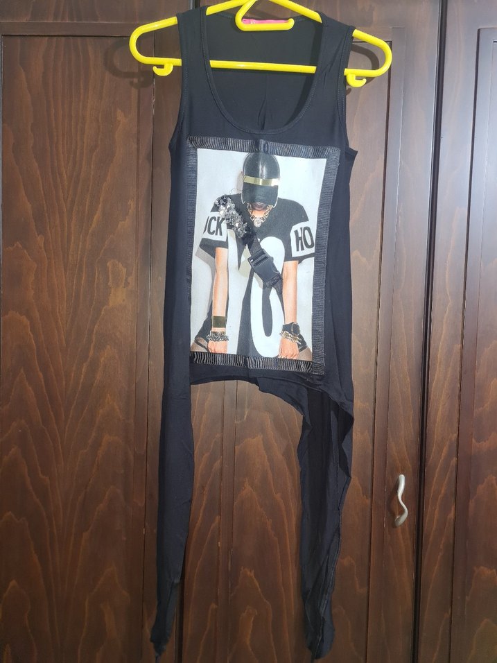 Kızlar için siyah renkli, baskılı ve asimetrik kesime sahip, tokalı detaylı, dar kesim kolsuz tişört. Yuvarlak yaka ve sokak stili tasarım içerir.
