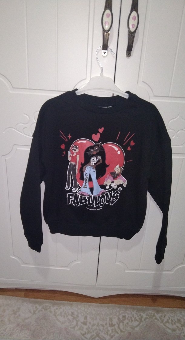 Uzun kollu, bisiklet yaka ve bol kesim siyah kız sweatshirtü. Baskılı goth tarzı tasarım ve düğme detayları ile yumuşak, sıcak kumaştan üretilmiştir.