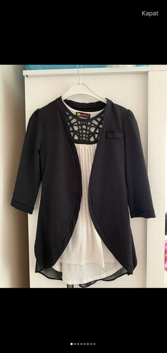 Siyah renkli kız bolero, bol kesim, kesik yaka ve uzun kolludur. Dantel detayları ve baskılı tasarımıyla gotik tarzı yansıtır.