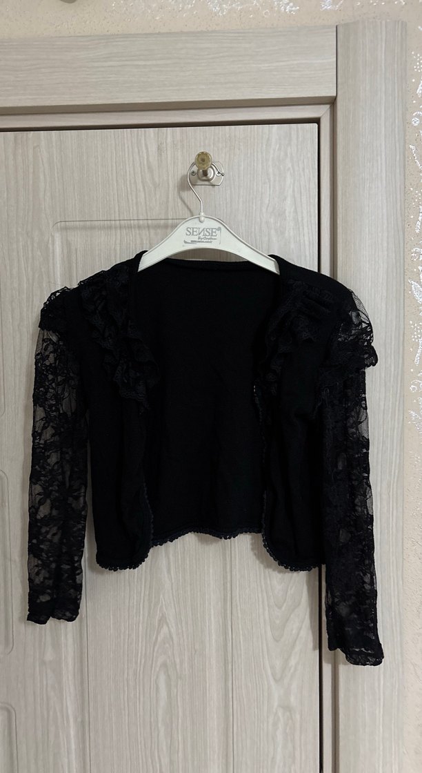 Dantel uzun kollu, nakışlı desenli, siyah ve dar kesim bolero. Yumuşak örme kumaştan, straplez yaka ve gotik tarzda klasik şıklık sunar. Xs s bedene uygun