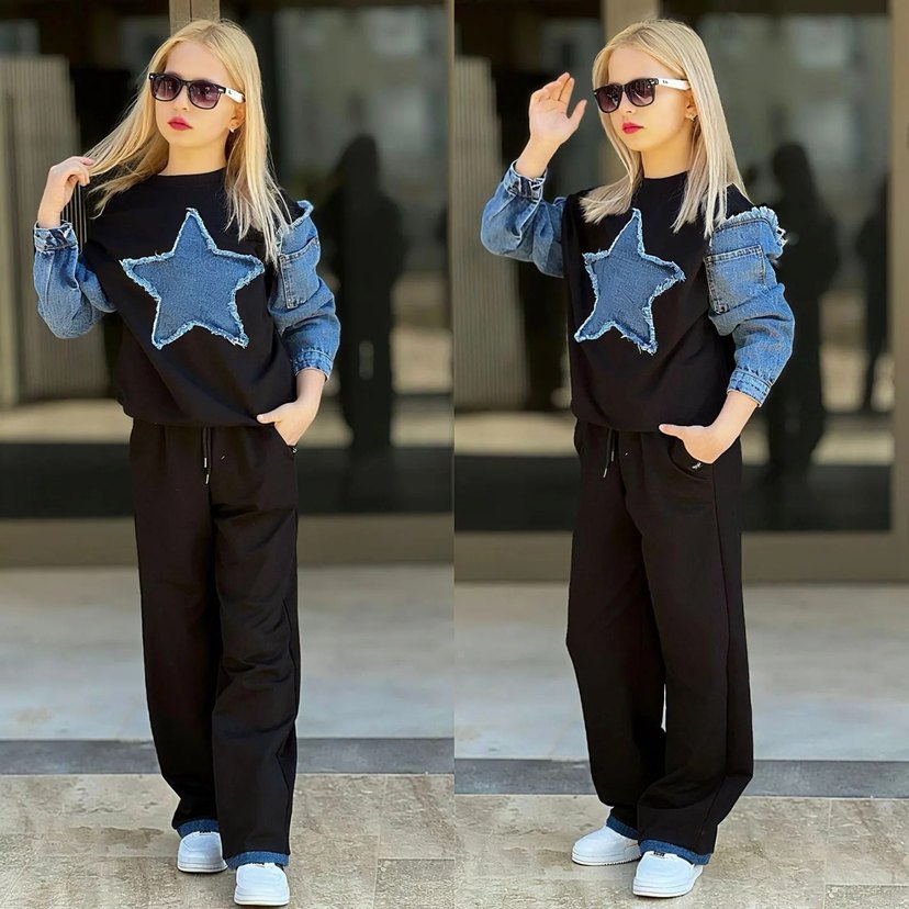 Kızlar için siyah denimden yapılmış, uzun kollu ve önünde büyük yıldız desenli, salaş kesim eşofman takımı. ⭐