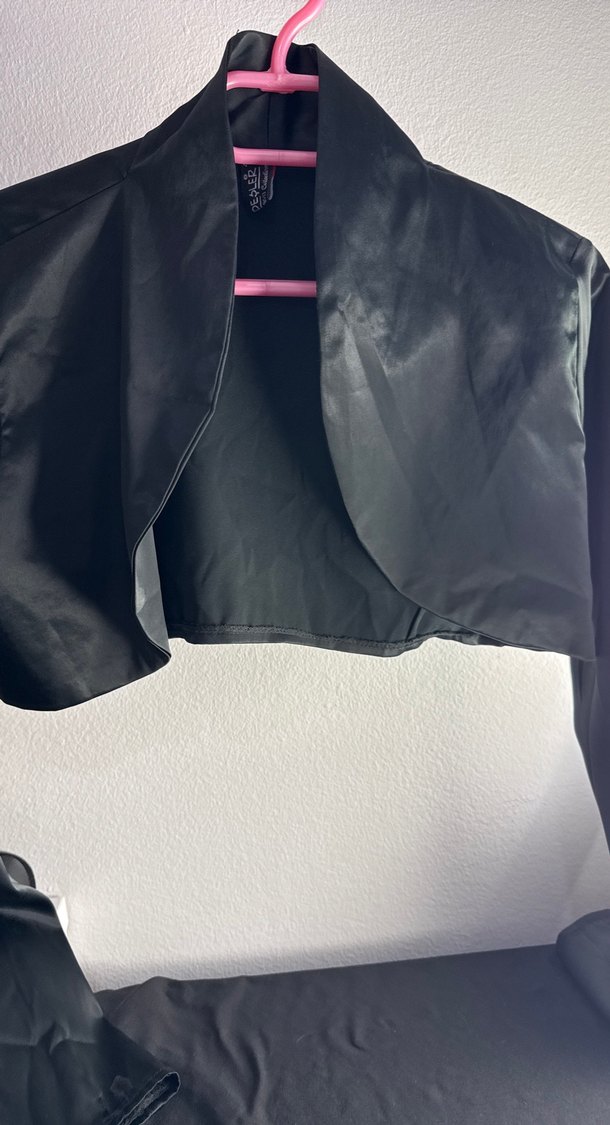 Sentetik kumaştan yapılmış, yakası kesimli, drapeli ve dar kesim siyah goth tarzı kız bolerosu. Askılı kolludur.