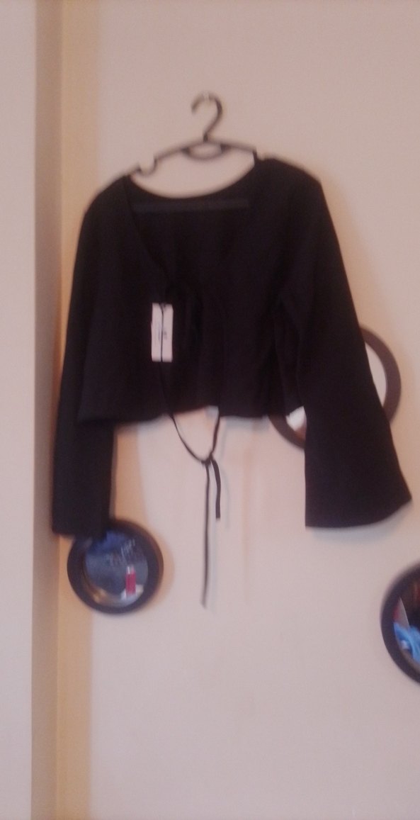 Kızlar için siyah bolero, bol kesim, uzun kollu ve yuvarlak yakalıdır. Düğmeli ön kısmı ve yumuşak, sıcak kumaşıyla dikkat çeker.