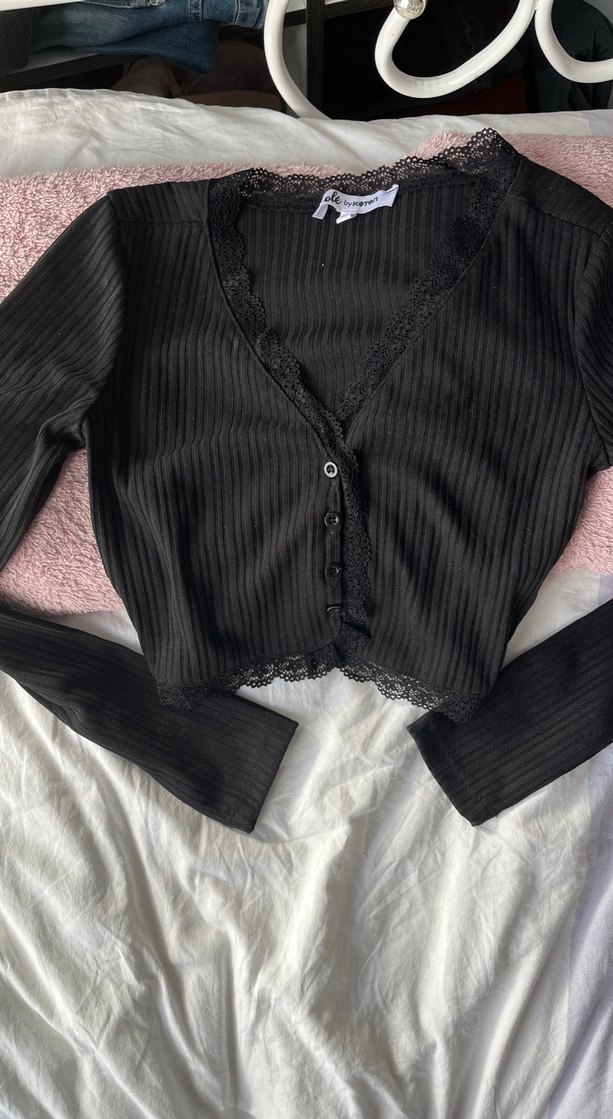Siyah, uzun kollu, düğmeli ve V yaka dantelli detaylı kızlar için fitted bolero. Sentetik kumaştan üretilmiş, goth tarzına uygun beden xs