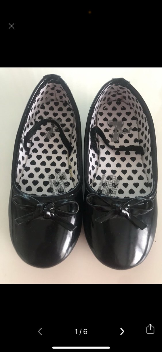 Kızlar için parlak siyah babet ayakkabılar, fiyonk detayı ve kalp desenli iç yüzeye sahip, kauçuk tabanlı.