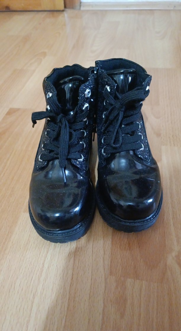 Kızlar için siyah lastik goth botlar, bağcıklı ve tokalı detaylara sahip, rock punk tarzını yansıtıyor. Düz ve koyu renklidir.